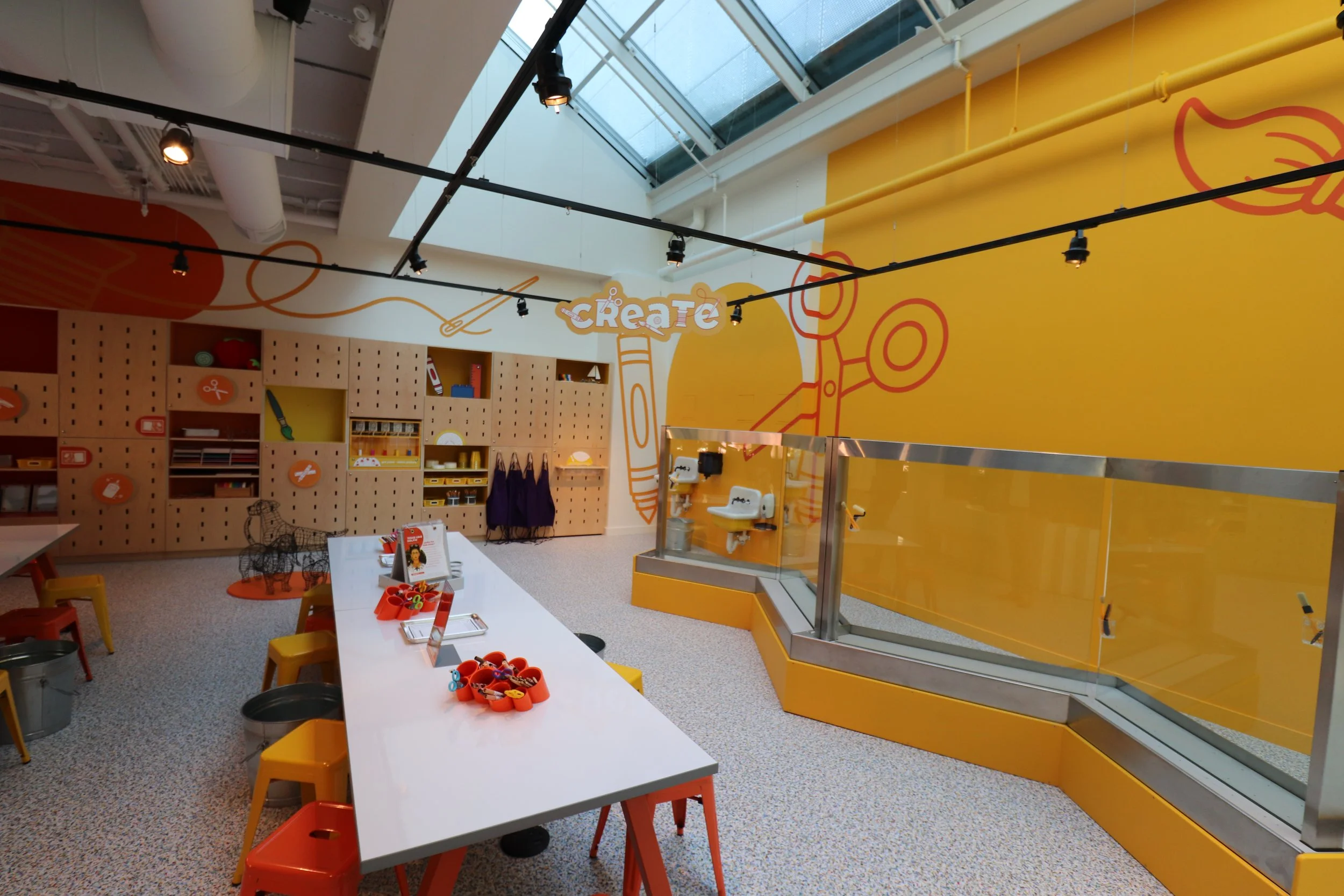 In the CREATE space, Beam installed a series of glass window panes above an elongated sink, allowing children to paint directly on the windows and rinse their brushes in the same space.